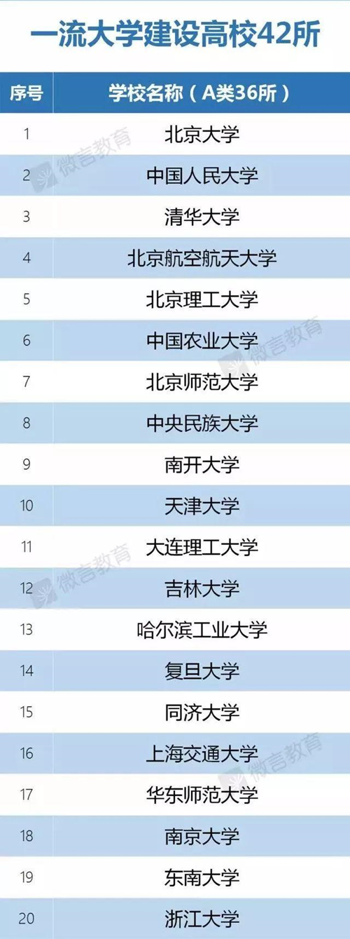 “雙一流”則是兩個(gè)平行的評(píng)價(jià)體系。“一流大學(xué)建設(shè)高校”重在一流學(xué)科基礎(chǔ)上的學(xué)校整體建設(shè)、重點(diǎn)建設(shè),全面提升人才培養(yǎng)水平和創(chuàng)新能力,共計(jì)42所,在原來(lái)39所985大學(xué)基礎(chǔ)上新增3所。