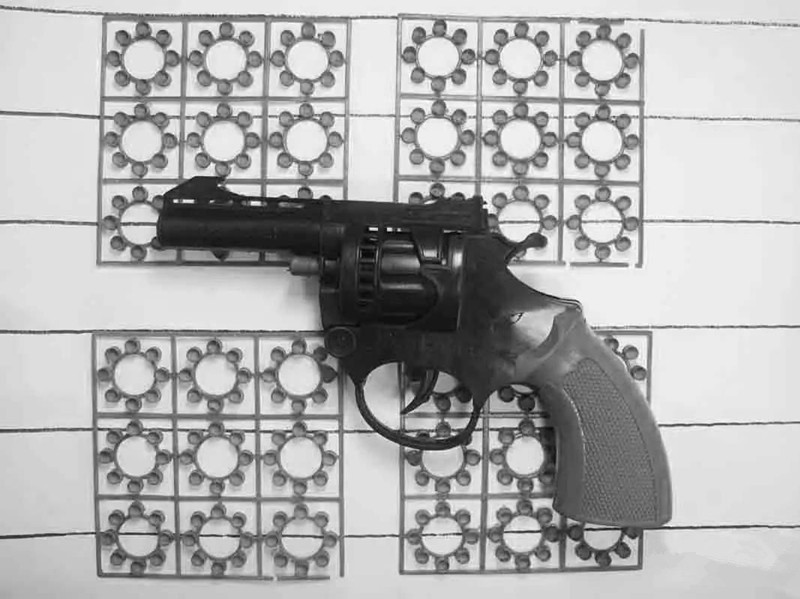 有一種槍,不會打出子彈,但是裝一種火藥味道的圓盤,打一下會有很大的聲音和火花?。。?!