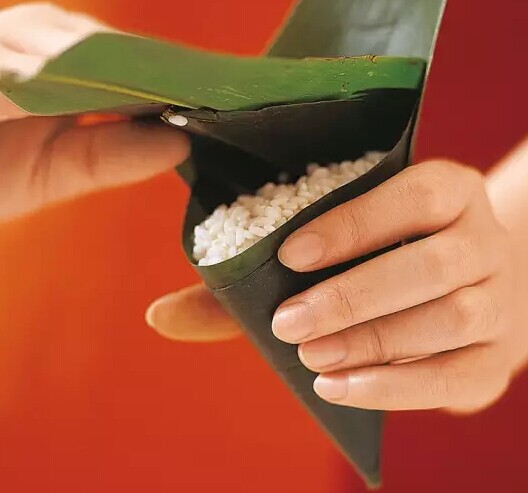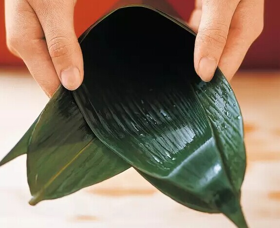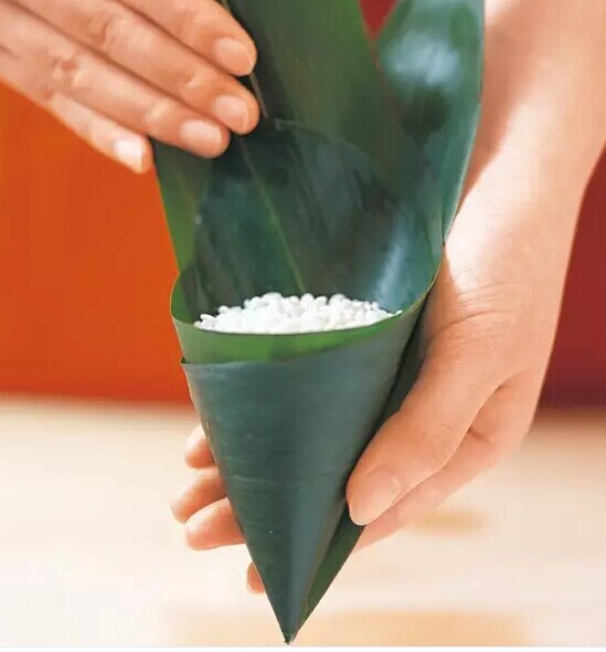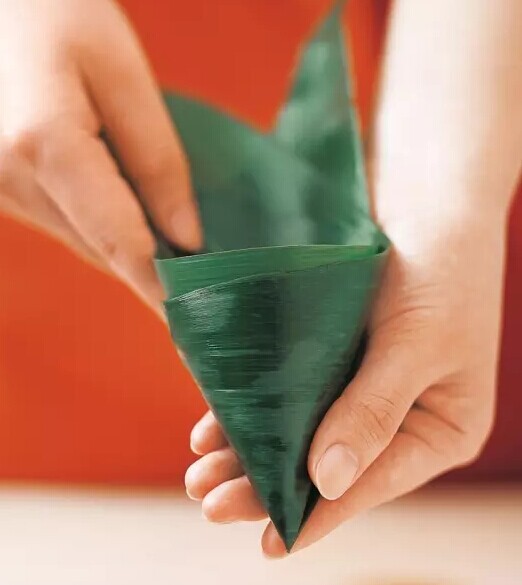 ?雙手捏住粽葉兩端,同時向內(nèi)交叉重疊,折成漏斗形,然后將內(nèi)側(cè)的粽葉在漏斗內(nèi)旋轉(zhuǎn)1圈,再回到原來的位置,使漏斗變成圓錐形。