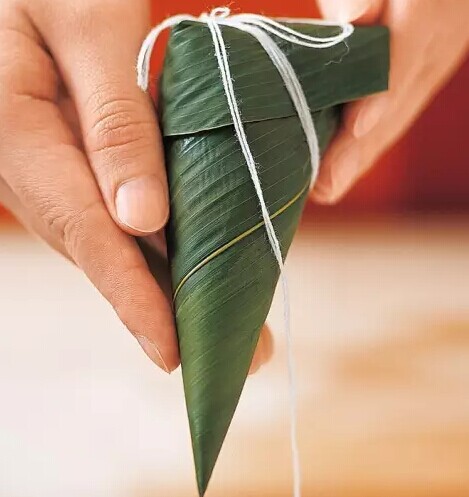?用繩子環(huán)繞粽子兩角數(shù)圈,將粽子緊緊裹住,并在頂端扎緊打結。(此步驟非常重要,如果繩子捆得不夠結實,在煮制過程中粽葉會有松開的可能,這樣就前功盡棄了)