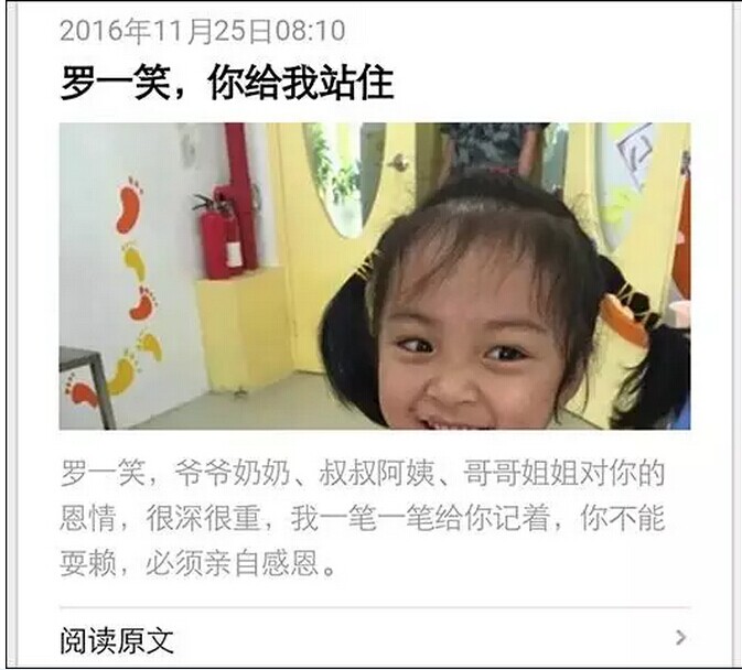 23 日,笑笑病危,住進(jìn)重癥監(jiān)護(hù)室。每天上萬的花費讓羅爾第一次感到了恐慌。經(jīng)過反復(fù)思考,羅爾最終選擇了網(wǎng)絡(luò)籌款的方式。于是有了這篇名為《羅一笑,你給我站住》的文章,開始占據(jù)朋友圈。