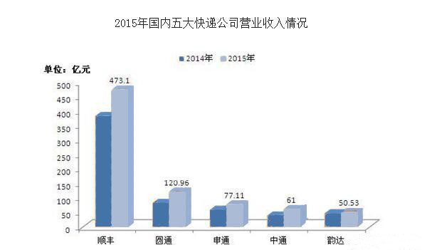 從包裹的來看的話,2016年中通、申通、圓通、韻達(dá)、EMS和順豐的市場份額分別為14.3%、12.4%、14.7%、10.5%、6.2%和8.2%。在營收方面,韻達(dá)2015年營收為50.53億元,圓通同期營收分別為120.96億元,順豐同期營收分別為473.1億元,申通同期營收分別為77.11億元。中通營收約61億元。
