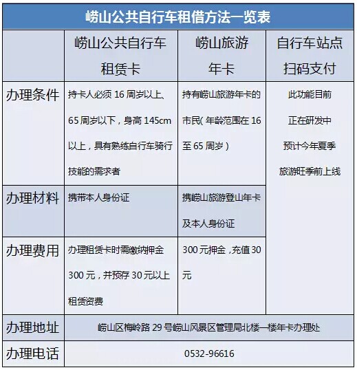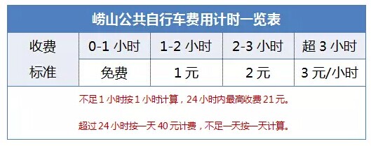 注:持嶗山登山年卡的市民,在辦理并預(yù)存過金額之后,使用公共自行車時可享受5小時內(nèi)免費的優(yōu)惠政策,5小時后,按普通自行車租賃卡的收費標(biāo)準計費。