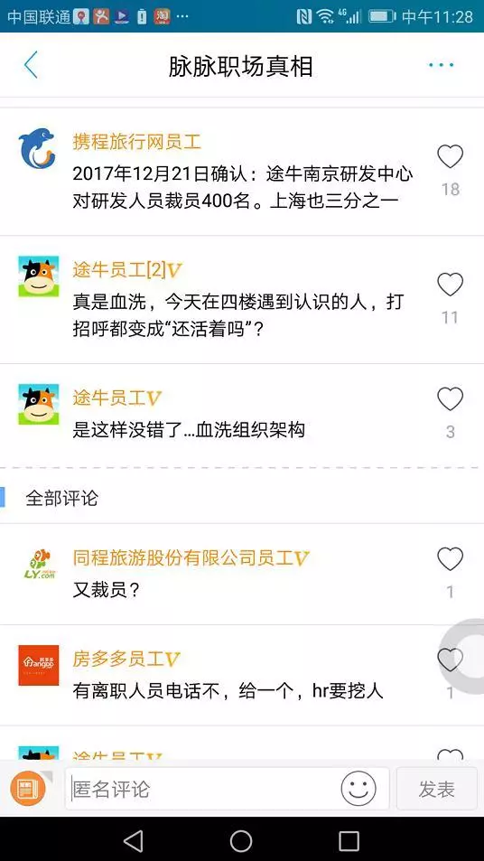 一位與途牛有合作的業(yè)內(nèi)人士表示,途牛僅機(jī)票業(yè)務(wù)部門就有兩百到三百的技術(shù)研發(fā)人員,因此,對(duì)于途牛這樣規(guī)模的公司,裁員400人屬于正常范圍,每家公司一年都要有10%-20%的自然裁員。