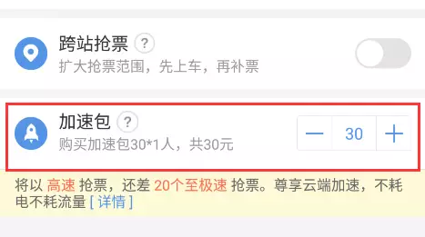 加速包有1元每個(gè)的,也有10元、20元、50元等分檔的,你可以自行選擇一次性購(gòu)買的數(shù)量,購(gòu)買的越多,顯示搶票成功的幾率就越大。除了加速包,還有成為VIP的選項(xiàng),收費(fèi)最貴為50元/年。