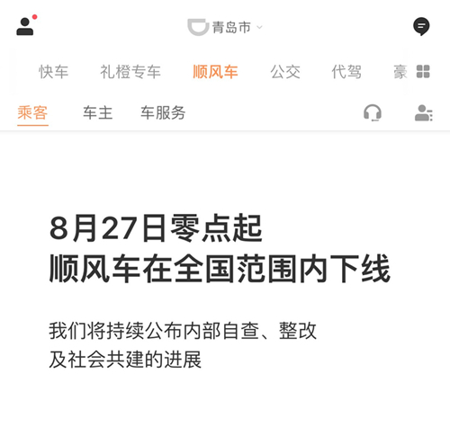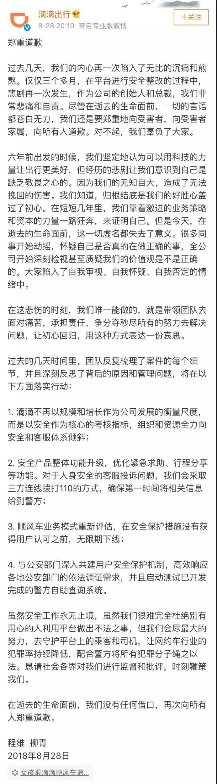 8月28日 20:20左右,滴滴出行創(chuàng)始人程維,總裁柳青終于對(duì)外發(fā)表了道歉聲明,滴滴不再以規(guī)模和增長(zhǎng)作為公司發(fā)展的衡量尺度,順風(fēng)車業(yè)務(wù)模式重新評(píng)估,在安全保護(hù)措施沒有獲得用戶認(rèn)可之前,無限期下線。