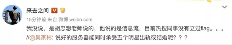 新浪微博技術(shù)專家胡忠想曾表示,現(xiàn)在可以支持八位明星并發(fā)出軌。但該公司CEO王高飛曾出面否認(rèn)這一消息。