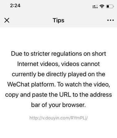 目前目前微信已經開放快手、微視的視頻分享到微信,但頭條系視頻產品如抖音、火山目前仍顯示因互聯(lián)網整治無法分享。另外,還有網友爆料稱,微信對抖音的封殺已經擴展到海外市場,海外用戶在微信上分享抖音會看到英文提示。