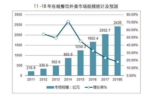 美團外賣、餓了么等外賣平臺誕生以來,在線外賣行業(yè)的市場規(guī)模高速發(fā)展,在2017年達(dá)到了2052.7億元,用戶數(shù)超過3億人。在線外賣市場還在不斷下沉,二三線城市還有寬廣的市場空間。