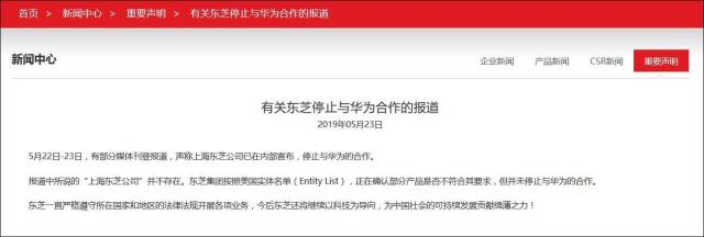 東芝中國官網(wǎng)23日發(fā)表一份聲明說,有部分媒體稱上海東芝公司已在內部宣布停止與華為的合作,但報道中所說的“上海東芝公司”并不存在。東芝集團“并未停止與華為的合作”。
