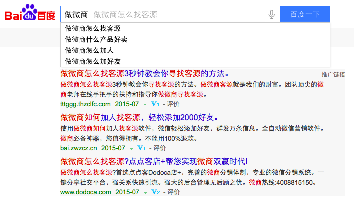 有沒有看到搜索引擎下面會為你自動補(bǔ)充一些關(guān)鍵詞?這就是現(xiàn)在搜索引擎發(fā)展的智能性,如果你平常你喜歡搜索一些問題的話,你就會發(fā)現(xiàn),搜索引擎會為自動補(bǔ)充一些關(guān)鍵詞。像這種你只需要輸入做微商,搜索引擎就會自動為你推薦一些搜索詞,比如做微商怎么找客源,做微商什么產(chǎn)品好賣等等。