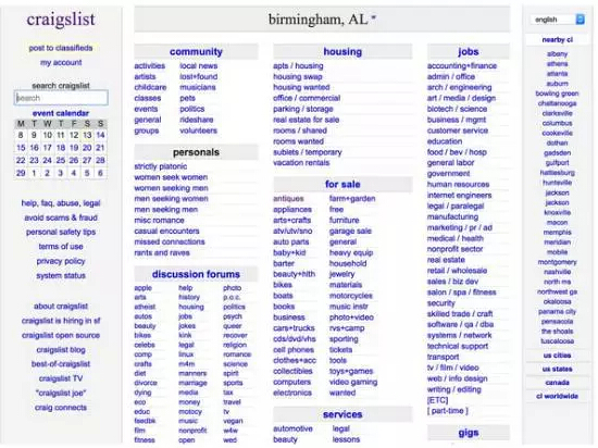 我通常用Craigslist的案例來分析。正如上圖你所看到的,這個(gè)網(wǎng)站的主頁(yè)就是一堆藍(lán)色的文字鏈,設(shè)計(jì)者把他們按照一定的分類進(jìn)行排放,這種設(shè)計(jì)就像1999年互聯(lián)網(wǎng)剛開始興起時(shí)的風(fēng)格樣式。