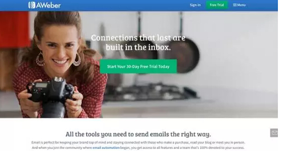 最近,Aweber通過更新主頁(yè)設(shè)計(jì),轉(zhuǎn)化率得到了明顯的提升。正如圖中banner文字描述的那樣:你和用戶的連接,一切從收件箱開始。