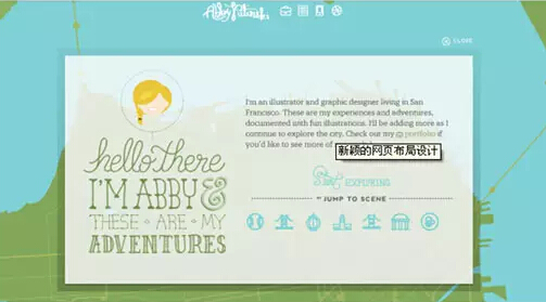 3、關于作品集類型的創(chuàng)意網(wǎng)站布局,如下面的網(wǎng)站,是一個作者的原創(chuàng)作品收藏。如果你沒有走進這個網(wǎng)站,看到小編給的這張圖片是否覺得它很普通,色彩也顯得暗淡,其實這個網(wǎng)站的布局非常有意思,從你進網(wǎng)站開始,頁面就會跟著你的鼠標所指的位置移動,點擊你想要了解的內容就可進入詳情頁。而網(wǎng)站左上角的心形則是整個網(wǎng)站的導航欄,進入退出一鍵搞定。