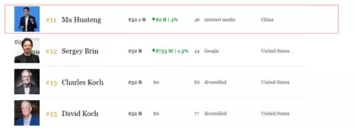 福布斯實時富豪榜數(shù)據(jù)顯示,中國首富馬化騰身家達到521億美元,已超過谷歌聯(lián)合創(chuàng)始人謝爾蓋·布林、美國科氏工業(yè)集團的科赫兄弟,在全球富豪榜排名中攀升至第11位。騰訊今日股價再創(chuàng)新高,站上470港元,市值突破4.5萬億港元。