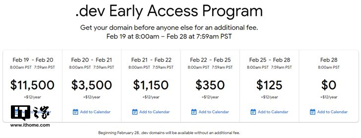 2月19日,谷歌開放公眾早期訪問階段,允許普通用戶進(jìn)行注冊。自美國時(shí)間2月19日8:00到2月28日7:59期間內(nèi)注冊.dev頂級域名,需要向谷歌繳納不等的費(fèi)用,美國時(shí)間2月28日之后,將免費(fèi)開放注冊。