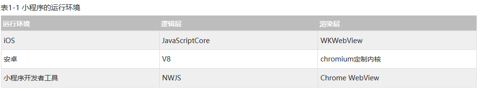 網(wǎng)頁(yè)開(kāi)發(fā)者需要面對(duì)的環(huán)境是各式各樣的瀏覽器,PC 端需要面對(duì) IE、Chrome、QQ 瀏覽器等,在移動(dòng)端需要面對(duì) Safari 、Chrome 以及 iOS、Android 系統(tǒng)中的各式 WebView 。而小程序開(kāi)發(fā)過(guò)程中需要面對(duì)的是兩大操作系統(tǒng) iOS 和 Android 的微信客戶端,以及用于輔助開(kāi)發(fā)的小程序開(kāi)發(fā)者工具,小程序中三大運(yùn)行環(huán)境也是有所區(qū)別的,如表1-1所示。